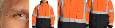 100% polyester woven 300-denier oxford shell with durable water-repellent (DWR) finish 5.2-ounce, 100% polyfill insulation, box diamond quilted body and sleeve lining Black bottom front and lower sleeves for a cleaner appearance Fabric waterproof rating: 5000MM Fully seam-sealed Adjustable, zip-removable rain hood with hook and loop closure and toggles Durable, reflective 2-inch tape meets ANSI 107 requirements and provides 360-degree visibility Full-length exterior storm flap Left chest bellows pocket Two open lower front pockets Molded center front zippered closure Elastic cuffs Elastic hem Decoration access pocket This garment must be fully zipped to be in compliance with ANSI 107 standards