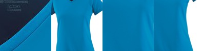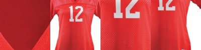 4.8 ounce 50% polyester/50% cotton jersey knit * Contrast color V-neck collar * Set-in sleeves with contrast color sleeve stripes