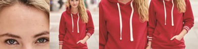 - Lapover neckline with contrast lined hood