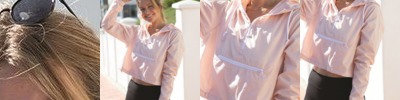 - Contrast topstitched self-fabric sleeve stripes
